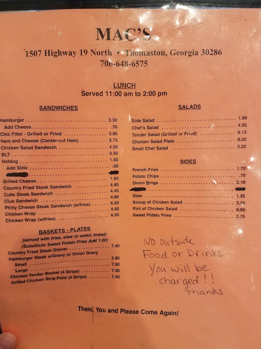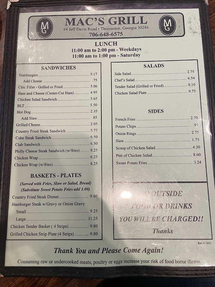 Welcome to MAC's GRILL, your vibrant hometown diner located at 94 Jeff Davis Rd, Thomaston, GA. Here, delightful flavors meet warm hospitality, making it a cherished spot for locals and visitors alike. Emphasizing hearty comfort food, MAC's GRILL serves standout dishes that evoke nostalgia.